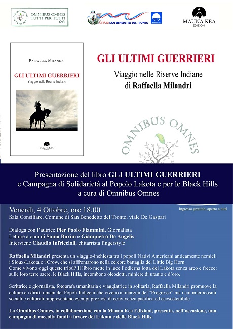 SAN BENEDETTO DEL TRONTO – Venerdì 4 ottobre 2019 alle 18.00, presso la Sala Consiliare di San Benedetto del Tronto, si svolgerà l’incontro a cura della Omnibus Omnes “Gli Ultimi Guerrieri”, dedicato ai Nativi Americani e alla presentazione del nuovo libro di Raffaella Milandri. “Gli Ultimi Guerrieri. Viaggio nelle Riserve Indiane” ha un impatto di denuncia a sostegno dell’ambiente e dei diritti umani, al punto che la autrice si schiera decisamente a favore degli Indiani d’America e contro il sistema consumistico e capitalistico occidentale che sfrutta ogni popolazione “debole”.
