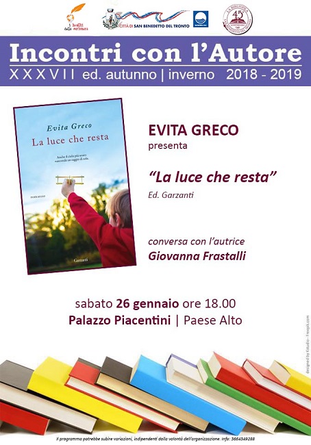 SAN BENEDETTO DEL TRONTO – Evita Greco presenterà il libro “La luce che resta” sabato 26 gennaio, alle ore 18.00, nella sala della poesia di Palazzo Piacentini.