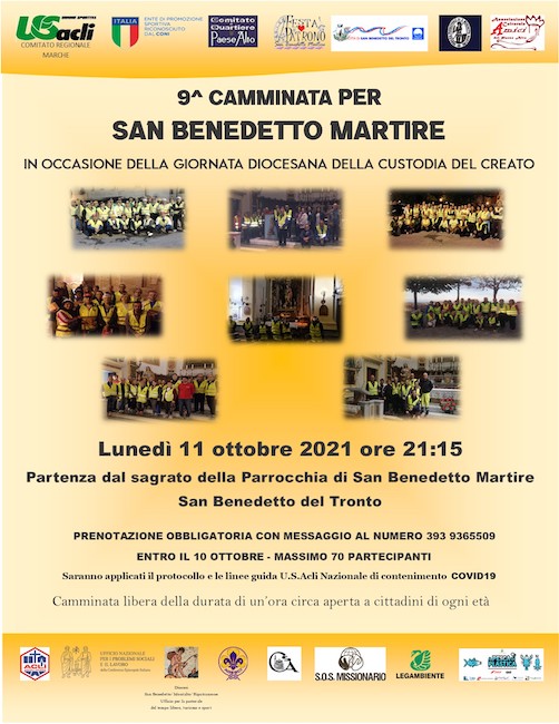 SAN BENEDETTO DEL TRONTO – Lunedì 11 Ottobre 2021, alle ore 21.15 con partenza dalla Chiesa di San Benedetto Martire, si svolgerà la nona Camminata per San Benedetto Martire ,in occasione della Giornata Diocesana della Custodia del Creato.