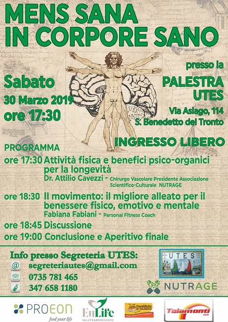 SAN BENEDETTO DEL TRONTO – Sabato 30 marzo 2019 ,alle ore 17.30 presso la palestra UTES di San Benedetto del Tronto, l’Università della Terza Età e l’associazione Nutrage organizzano una conferenza scientifico-divulgativa che ha come titolo “ Mens Sana in Corpore Sano”. La conferenza verrà tenuta dal Dr.Attilio Cavezzi, chirurgo vascolare e presidente dell’associazione Nutrage, e da Fabiana Fabiani, personal coach esperta in fitness.