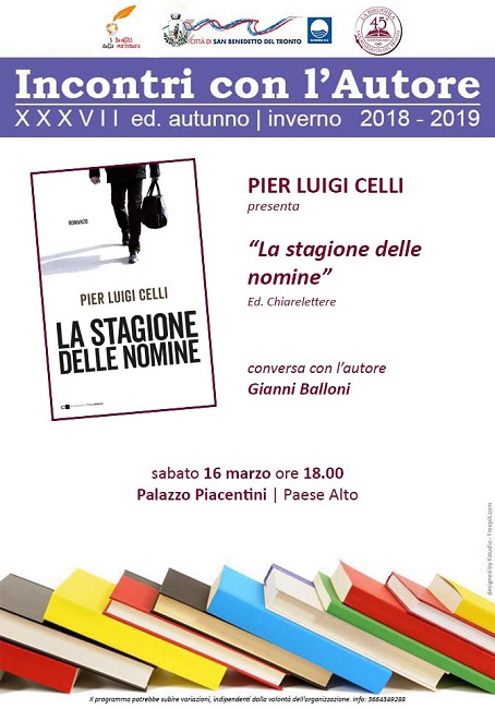 SAN BENEDETTO DEL TRONTO – Per il ciclo “Incontri con l’Autore Autunno Primavera 2018/2019” Pierluigi Celli presenterà il libro “La Stagione delle Nomine” sabato 16 alle ore 18 presso la Sala della Poesia Palazzo Piacentini. Conversa con l’Autore Gianni Balloni, Evento organizzato da I Luoghi della Scrittura e dalla Libreria La Bibliofila con il patrocinio ed il sostegno dell’Amministrazione comunale e della Regione Marche