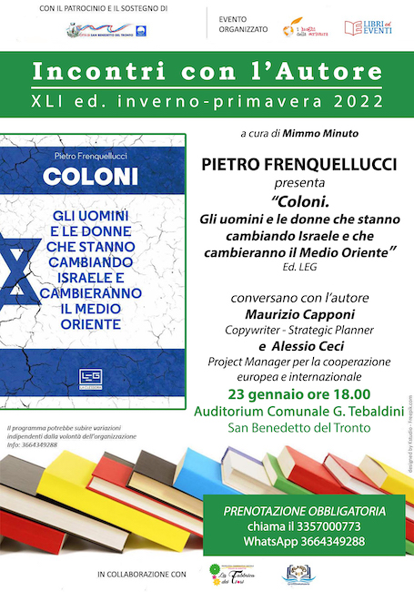 SAN BENEDETTO DEL TRONTO – Domenica 23 gennaio 2022, alle ore 18, all’Auditorium Comunale “G.Tebaldini” di San Benedetto del Tronto, Pietro Frenquellucci presenterà il libro “Coloni. Gli uomini e le donne che stanno cambiando Israele e cambieranno il Medio Oriente”. Conversano con l’Autore Maurizio Capponi, Copywriter – Strategic Planner e Alessio Ceci, Project Manager per la cooperazione europea e internazionale.