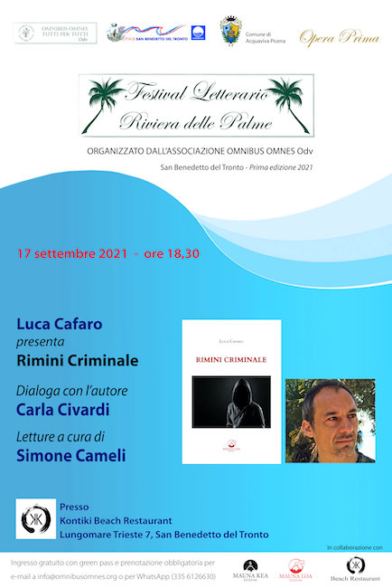 Venerdì, 17 settembre 2021, alle ore 18.30, presso lo Chalet Kontiki sul Lungomare di San Benedetto, si terrà la presentazione del thriller “Rimini criminale” di Luca Cafaro, edito dalla casa editrice sambenedettese Mauna Loa Edizioni. Cafaro è laureato in Scienze Motorie e vive e insegna a Rimini. Il suo è un thriller avvincente, dal finale mozzafiato: una serie di crimini, apparentemente non collegati tra loro, dilaga tra le strade cittadine e le campagne di Rimini. Per il vicequestore Lombardi e la sua squadra è una matassa davvero difficile da sbrogliare. Nonostante l’ambientazione noir, Cafaro offre un romanzo dai risvolti umani e toccanti, un “giallo-rosa”, dove i personaggi vivono una intensa umanità. Dice Luca Cafaro: “Sono molto lieto di questo evento al Festival: a causa della pandemia, ho dovuto rimandare la presentazione ufficiale”.
