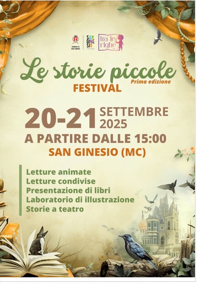 SAN GINESIO (MC) – “Festival delle storie piccole” è il nuovo progetto ideato e realizzato dall’Associazione Tra Le Righe ODV che prenderà il via oggi, sabato 20 e Domenica 21 settembre a San Ginesio con un ricco programma di eventi e attività.