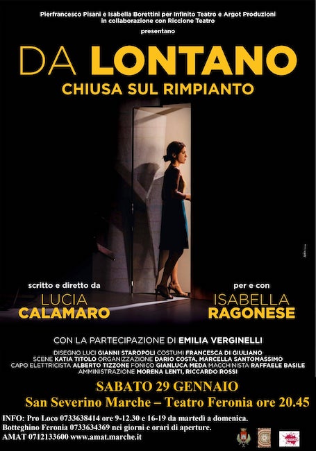 SAN SEVERINO MARCHE – Dopo il successo, di pubblico e di critica, del travolgente Enzo Decaro che ha portato in scena al Feronia lo spettacolo senza tempo “Non è vero ma ci credo” di Peppino De Filippo, i Teatri di Sanseverino tornano a proporre un altro importante appuntamento con la prosa: sabato prossimo (29 gennaio) ancora il Feronia ospiterà il monologo di Lucia Calamaro, scritto per Isabella Ragonese, “Da lontano”.