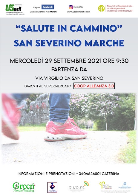 SAN SEVERINO MARCHE – In occasione della Settimana europea dello sport, iniziata il 23 settembre e che terminerà giovedì 30 settembre, mercoledì 29 settembre 2021 si svolgerà una camminata sportiva con partenza alle ore 9,30 davanti al supermercato Coop Alleanza 3.0 in via Virgilio da San Severino.