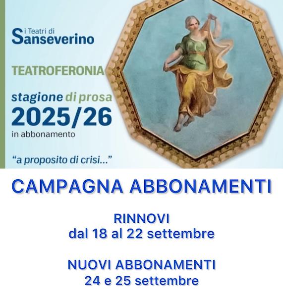 SAN SEVERINO MARCHE – A partire da giovedì prossimo (18 settembre) si aprirà la campagna abbonamenti per la stagione di prosa 2025-26 del teatro Feronia con la prima fase interamente dedicata ai rinnovi per i vecchi abbonati, un’opportunità per assicurarsi il posto per una stagione che si preannuncia ricca e stimolante.