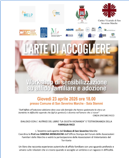 SAN SEVERINO MARCHE – Domani (giovedì 23 aprile), alle ore 18, la sala Stemmi del Palazzo Comunale ospiterà l’incontro dal titolo “L’arte di accogliere”, un workshop di sensibilizzazione dedicato ai temi dell’affido familiare e dell’adozione. L’iniziativa, promossa dall’associazione Help Sos Salute e Famiglia con il patrocinio del Comune di San Severino Marche e il sostegno della Caritas Vicariale, si inserisce nel più ampio progetto “CASA-Comunità, Alleanze e Solidarietà per l’Accoglienza”, un’importante azione di rete finanziata dal Ministero del Lavoro e delle Politiche Sociali attraverso il Fondo per il terzo settore.