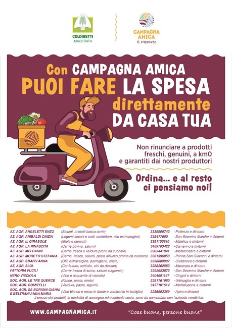 E’ importante che ciascuno di noi, per quanto possibile, dia una mano, soprattutto in questo momento così delicato. Non serve nessuna corsa agli approvvigionamenti, che non si sono interrotti e mai lo faranno. Ancora una volta accogliamo l’invito di Coldiretti a sostenere l’acquisto dei prodotti italiani e a sostenere l’iniziativa Campagna Amica che consegnerà direttamente a casa bontà a km0 (Azienda agricola Cinzia Anibaldi tel. 335477000 per legumi, confetture e olio, oppure Fattoria Fucili tel. 3392653875 per carne fresca e salumi).