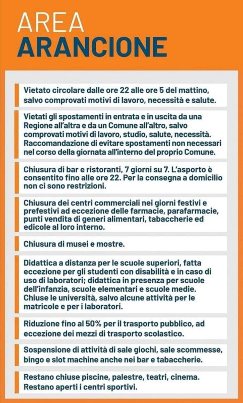 “Da domenica – ricorda il primo cittadino settempedano – le Marche sono finite in “area arancione” quindi in una zona con restrizioni più rigide rispetto a quella gialla ma più lievi di quella rossa. In particolare le nuove restrizioni prevedono divieti di spostamento in entrata e in uscita da un Comune all’altro e da una Regione all’altra, salvo comprovati motivi di lavoro, studio, salute o necessità. La raccomandazione è quella di evitare spostamenti non necessari nel corso della giornata all’interno anche del proprio Comune. Bar e ristoranti possono solo vendere cibo in modalità esclusivamente da asporto fino alle ore 22. Per la consegna a domicilio, invece, non ci sono restrizioni. Restano poi in vigore le limitazioni già previste come il divieto di circolazione dalle ore 22 alle 5 del mattino, sempre salvo comprovati motivi di lavoro, necessità e salute. Chiusi anche musei e mostre, chiusi i centri commerciali nei giorni festivi e prefestivi ad eccezione della farmacie, delle parafarmacie, dei punti vendita di generi alimentari, delle tabaccherie e delle edicole che si trovano al loro interno. Per le scuole superiori continua la didattica a distanza, fatta eccezione per gli studenti con disabilità e in caso di uso di laboratori. La didattica resta in presenza – spiega ancora il sindaco Piermattei – per le scuole dell’infanzia, le scuole elementari e le scuole medie. Chiuse anche le università, salvo alcune attività per le matricole e per i laboratori. Il trasporto pubblico locale, ad eccezione dei mezzi di trasporto scolastico, subirà una riduzione del 50%. Sono sospese le attività di sale giochi, sale scommesse, bingo e slot machine anche nei bar e nelle tabaccherie. Restano infine chiuse piscine, palestre, teatri, cinema mentre sono aperti i centri sportivi”.