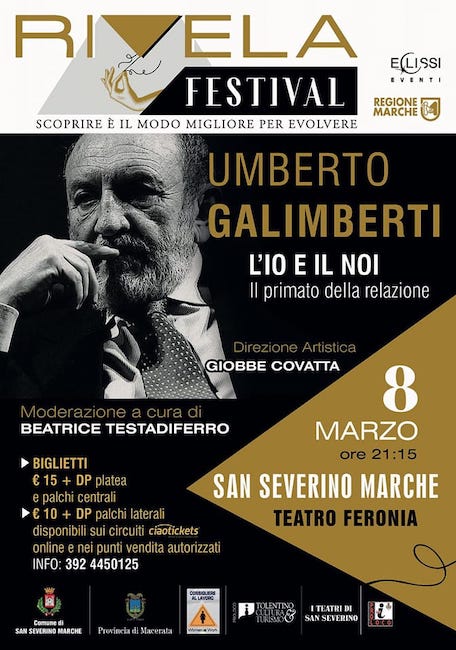 SAN SEVERINO MARCHE – La Città di San Severino Marche si appresta a vivere un 8 marzo pieno di spunti di riflessione. In occasione della Festa della Donna il teatro Feronia ospiterà, infatti, il grande filosofo, giornalista, saggista e psicoanalista italiano Umberto Galimberti in una nuova data del Rivela Festival, rassegna organizzata da Eclissi Eventi con il sostegno della Regione Marche, il patrocinio del Comune e della Provincia, la collaborazione della Pro Loco di Tolentino Cultura e Turismo, dei Teatri di Sanseverino e della Pro Loco Iat di San Severino Marche.