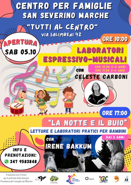 Il progetto “Tutti al Centro” è finanziato con il fondo per le politiche della famiglia della Presidenza del Consiglio dei Ministri e curato, in collaborazione tra loro, dall’Ambito Territoriale Sociale 17, dall’Unione Montana Potenza Esino Musone, dai Centri per le famiglie degli Ats 17 e Ats 18, dalla cooperativa Cooss, dall’associazione Scacco Matto, dalle realtà “C’era una volta” e “Con i bambini” e con il patrocinio della Città di San Severino Marche.
