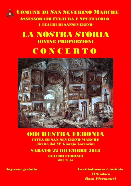 SAN SEVERINO MARCHE – L’Orchestra Feronia Città di San Severino Marche torna sul palco per il tradizionale Concerto di Natale. L’appuntamento è oggi,sabato 22 dicembre 2018, a partire dalle ore 21, al Feronia con ingresso gratuito. In programma brani classici di Mozart, Albinoni, Beethoven e Shostakovich e musica per il cinema scritta da Ennio Morricone, Consuelo Velazquez, John Leavitt, JustinHurwitz e Jimmy Davis.