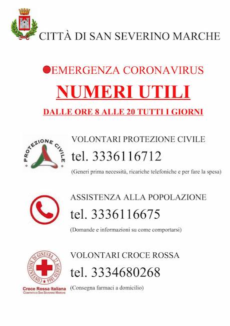 Restano attive le due linee telefoniche riaperte dal Comune di San Severino Marche, in funzione dalle ore 8 alle 20, per venire incontro alla popolazione. Servono per avere assistenza ma anche per richieste di beni di prima necessità oltre a farmaci, ricariche telefoniche e per fare la spesa.
