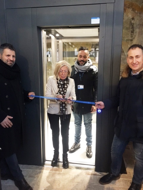 SAN SEVERINO MARCHE – Taglio del nastro, con apertura delle porte del nuovo impianto, per l’ascensore che la società Kone, azienda leader a livello internazionale nel settore degli automatismi per edifici, scale e tappeti mobili, ha donato al Comune di San Severino Marche installandolo nella nuova sede del centro socio educativo riabilitativo diurno “Il Girasole”.