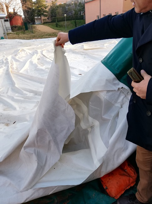 La struttura, una cupola a doppia membrana di 30 metri di lunghezza per quasi 19 di larghezza, era stata donata dalla società Commit Siderurgica, azienda di Veggiano, e inaugurata a maggio. Già in passato la copertura era stata fatta oggetto dell’attenzione dei vandali.