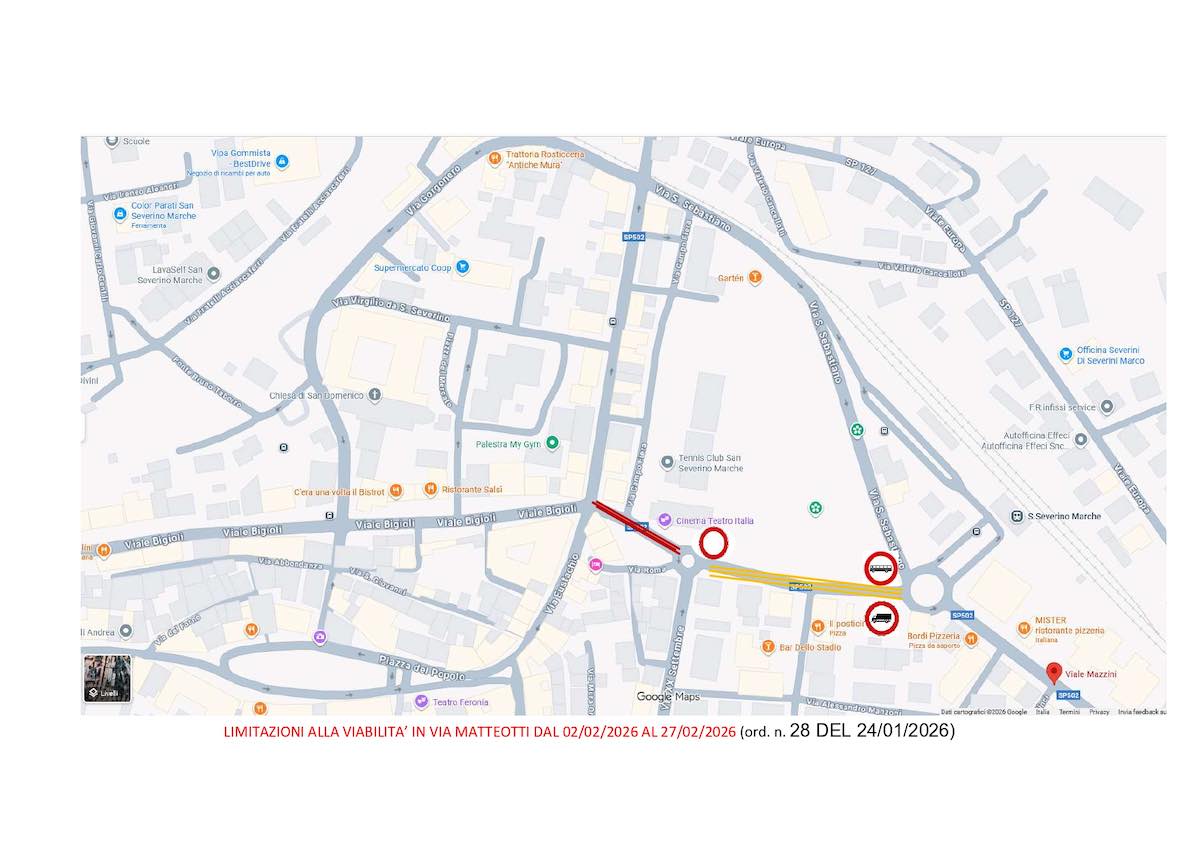 Dal 2 al 27 febbraio via Matteotti sarà interdetta al transito veicolare nel tratto che va dalla rotatoria Avis, posta all’intersezione con via Roma, fino all’intersezione con viale Eustachio e via Eustachio