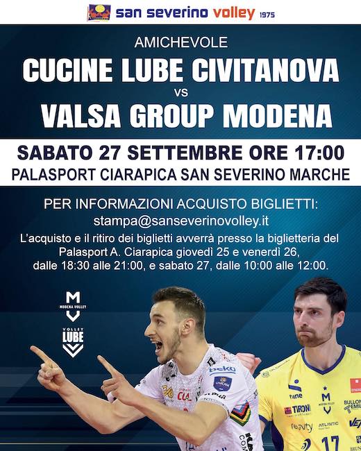 SAN SEVERINO MARCHE – Continua la grande festa per i 50 anni dalla nascita dell’Asd San Severino Volley guidata dal presidente Giovanni Soverchia. Sabato 27 settembre, alle ore 17, il palasport comunale “Albino Ciarapica” Città di San Severino Marche ospiterà una prestigiosa partita amichevole tra due colossi della Superlega: la Cucine Lube Civitanova e la Valsa Group Modena, squadre tra le più titolate a livello nazionale e internazionale.