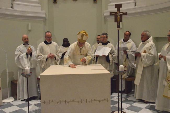 SAN SEVERINO MARCHE – “Il giorno 11 febbraio dell’anno del Signore 2024, sesta domenica del tempo ordinario, undicesimo di pontificato di Papa Francesco, il vescovo di Cremona, monsignor Antonio Napolioni, con il consenso di monsignor Francesco Massara, arcivescovo della Diocesi di Camerino-San Severino Marche, dedicò questo altare, secondo il rito del Pontificale Romano”.