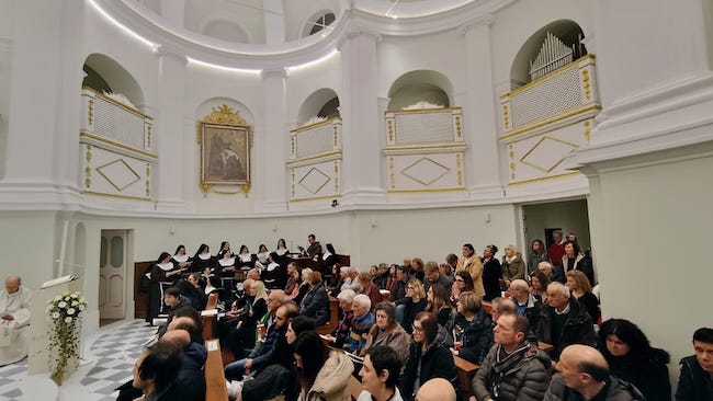 Un intenso momento di fede quello che ha accompagnato la duplice cerimonia con la quale le sorelle Clarissse di Santa Chiara, a San Severino Marche, hanno portato a termine non solo il percorso di ristrutturazione e consolidamento del luogo di fede che da sempre le raccoglie in preghiera ma anche un lungo cammino che, dal Concilio Vaticano II ad oggi, ha visto la stessa comunità di Sorelle Povere riflettere più volte sulla necessità di un adeguamento liturgico della chiesa del monastero intitolata a “Santa Maria Annunziata”.