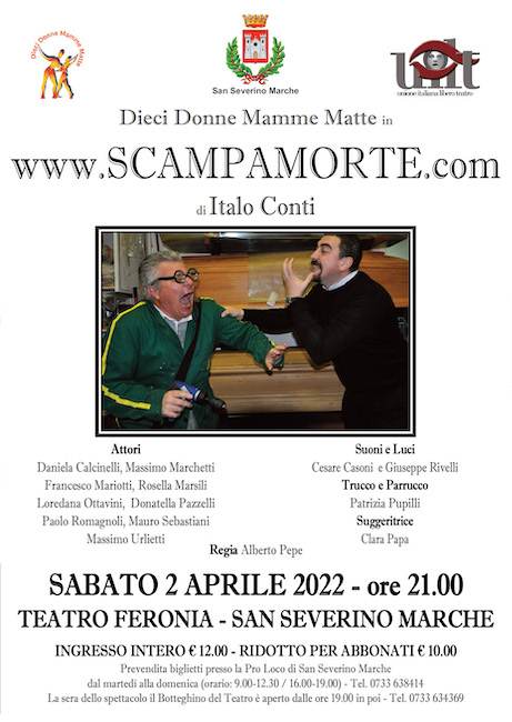 SAN SEVERINO MARCHE – Rinviato a sabato 2 aprile, alle ore 21 al Feronia, l’appuntamento con la divertente commedia in due atti di Italo Conti “www.scamparmorte.com” che verrà portata in scena della compagnia camerte de Le Dieci Donne Mamme Matte.
