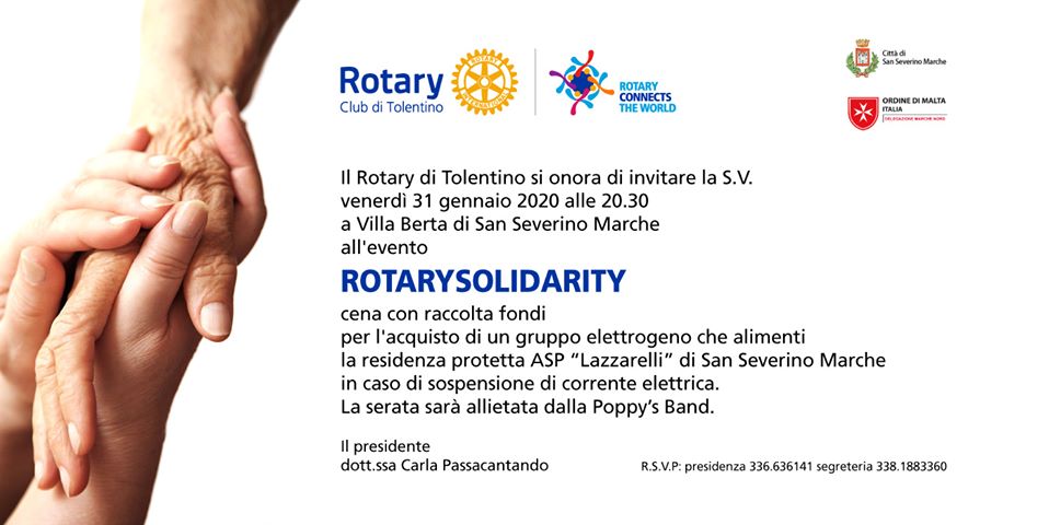 L’iniziativa, dal titolo “Rotarysolidarity”, propone una cena che sarà allietata dalla Poppy’s band di Belforte del Chienti. L’appuntamento è patrocinato dal Comune di San Severino Marche e dall’Ordine di Malta Italia, delegazione Marche nord.