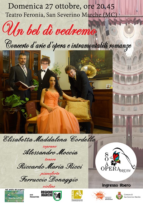 SAN SEVERINO MARCHE – Domenica prossima (27 ottobre), il teatro Feronia di San Severino Marche ospita, con inizio alle ore 20,45, lo spettacolo “Un bel dì vedremo”, concerto d’arie d’epoca e intramontabili romanze che verrà portato in scena, in occasione della seconda esibizione in provincia, dalla formazione lirico classica “SoapOpera Dream”.