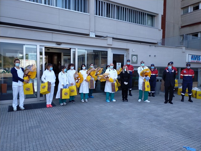 Insieme ai sanitari e al personale dell’ospedale alla consegna ha preso parte anche il direttore di presidio, dottor Massimo Sgattoni, il quale ha calorosamente ringraziato per la benefica iniziativa. A far sentire la vicinanza delle istituzioni e della Città di San Severino Marche è intervenuto pure il sindaco, Rosa Piermattei: “Ancora una volta desidero ringraziare pubblicamente i nostri dottori e tutto il personale sanitario, oltre ai Carabinieri, alle forze dell’ordine, ai tantissimo volontari, per quello che ogni giorno fanno a favore della nostra comunità anche in questo periodo di particolare criticità. Spesso in silenzio, spesso dietro le quinte, spesso senza neppure ricevere un grazie, danno a noi tutti una grande speranza. Sono certa che tutto questo ci aiuterà a ritrovarci presto e sarà un motivo in più per tornare a festeggiare il nostro stare insieme”.