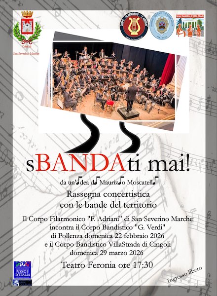 SAN SEVERINO MARCHE – La musica delle bande torna protagonista con una nuova e significativa iniziativa: nasce il progetto “sBANDAti mai!”. L’idea, nata dall’estro del professor Maurizio Moscatelli, si affianca alle già note “Sonore lezioni” per valorizzare il ruolo sociale e culturale dei complessi bandistici del territorio.