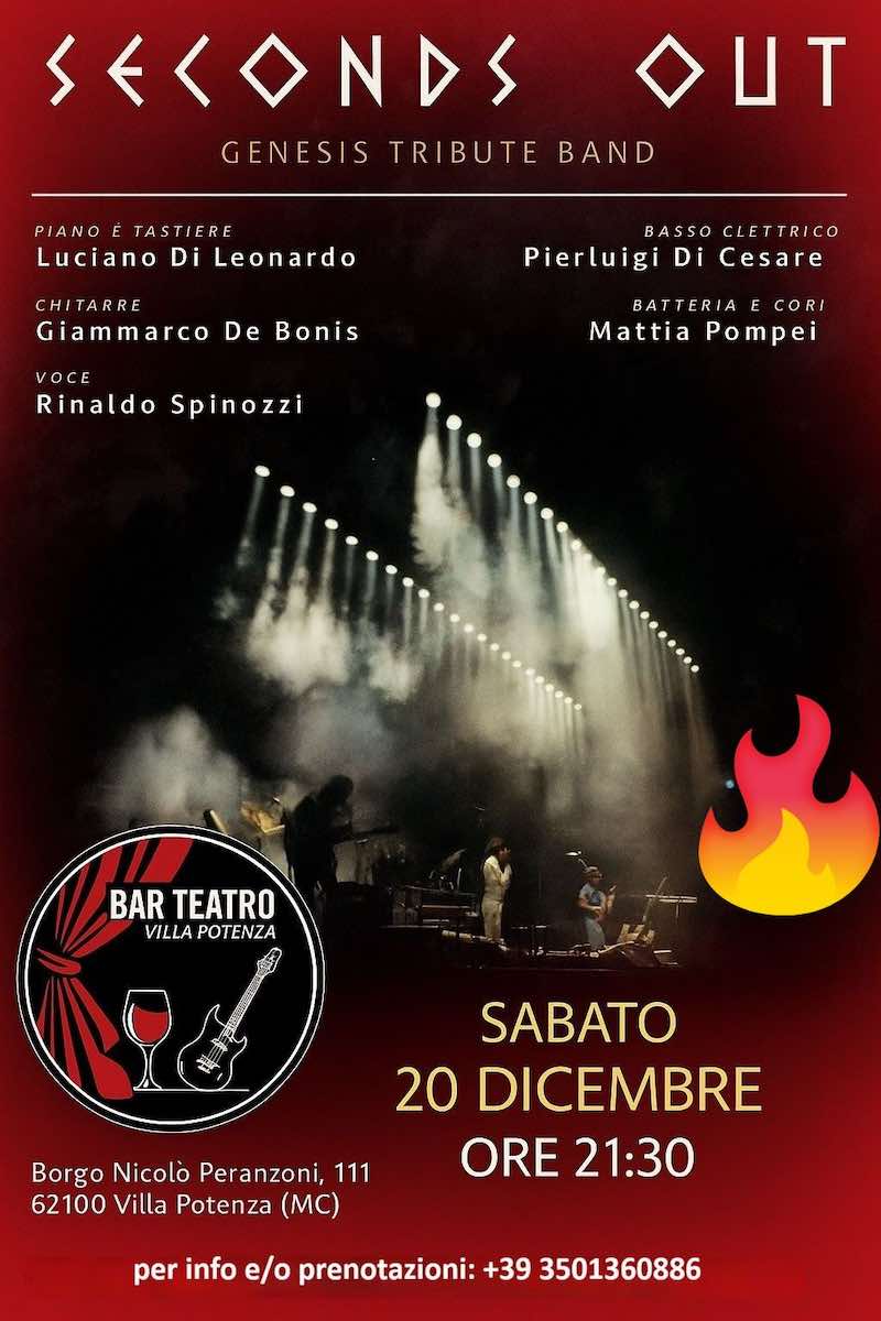Sabato 20 dicembre, al Bar Teatro di Villa Potenza, tornano i Seconds Out per una serata dedicata ai Genesis; domenica 21 invece concertone dei Gang con aperitivo