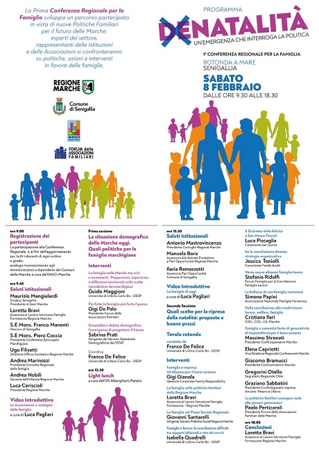 SENIGALLIA – “Denatalità, un’emergenza che interroga la politica” sarà il tema della 1° Conferenza regionale della Famiglia organizzata per sabato 8 febbraio alla Rotonda a Mare di Senigallia (9.30 – 18.30) grazie alla collaborazione della Regione Marche con il Forum delle Associazioni familiari, l’Anci e il Comune di Senigallia. L’appuntamento è stato presentato questa mattina nel corso di una conferenza stampa dall’Assessore alla Famiglia, all’Istruzione, alla Formazione e al Lavoro Loretta Bravi insieme al presidente del Forum delle Associazioni familiari Paolo Perticaroli e all’assessore del Comune di Senigallia Ilaria Ramazzotti. Il dibattito prenderà spunto da uno studio su “La famiglia nelle Marche tra crisi e mutamenti” redatto dell’Università degli Studi di Urbino dal quale si evince che i nati vivi nelle Marche nel 2018 sono 10.171: 3.025 in meno rispetto al 2012 (-22,9%) e 4.316 in meno in confronto al 2008 (-29,8%).