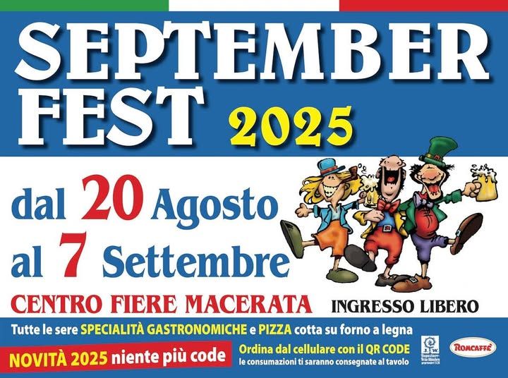 MACERATA – Da mercoledì 20 agosto a domenica 7 settembre 2025, al Centro Fiere di Villa Potenza torna September Fest, l’evento conclusivo dell’estate maceratese che unisce musica, convivialità e sapori internazionali in un’atmosfera unica.