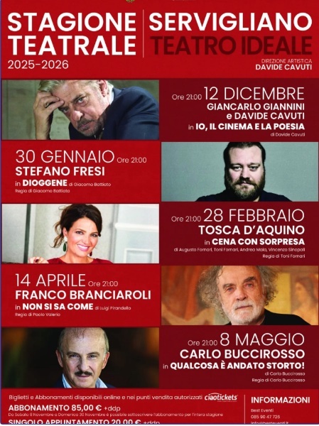 La prima Stagione Teatrale dell’Ideale di Servigliano, prodotta da Best Eventi con la collaborazione del Comune di Servigliano e la direzione artistica affidata al maestro Davide Cavuti, proporrà cinque spettacoli con la partecipazione di alcuni dei più grandi interpreti e registi del teatro italiano.