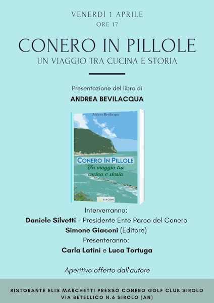 SIROLO – Venerdì primo aprile 2022, a partire dalle ore 17.00, presso il Ristorante di Elis Marchetti al Conero Golf Club di Sirolo, si terrà l’evento di presentazione del libro di Andrea Bevilacqua “Conero in Pillole: Un Viaggio tra Cucina e Storia” (Giaconi Editore). Presenzierà all’evento, in veste di realtà patrocinante, l’Ente Parco del Conero; nella persona del Presidente Daniele Silvetti. La conduzione è stata affidata all’affiatatissimo duo composto dalla giornalista e imprenditrice Carla Latini e dal noto speaker radiofonico Luca Tortuga (Radio Serena).