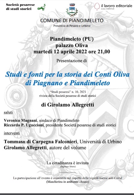 PIANDIMELETO (PU) – Martedì 12 aprile 2022, alle ore 21.00, a palazzo Oliva, a Piandimeleto, la Società pesarese di studi storici presenterà il n. 10 di “Studi pesaresi” sul tema “Studi e fonti per la storia dei conti Oliva di Piagnano e Piandimeleto” di Girolamo Allegretti .