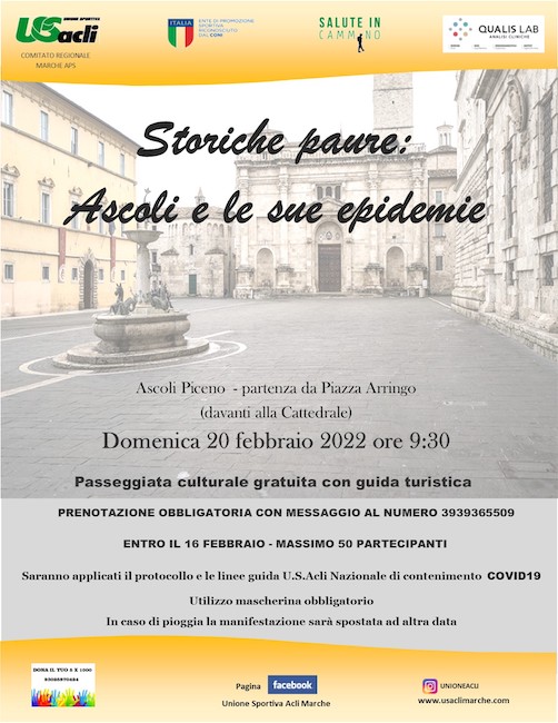 ASCOLI PICENO – “Storiche paure: Ascoli e le sue epidemie”: l’Unione Sportiva Acli Marche Aps, per il 20 febbraio, con partenza da Piazza Arringo alle 9,30, ha organizzato un nuovo tour culturale dedicato a conoscere la storia delle pandemie nella città delle cento torri. La partecipazione è gratuita, in caso di pioggia o maltempo la manifestazione sarà spostata ad altra data, l’utilizzo della mascherina è obbligatorio.