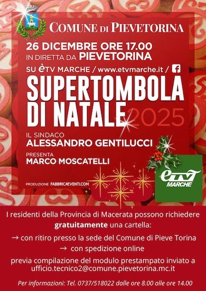 La cartella per partecipare alla Super Tombola potrà essere richiesta direttamente al Comune di Pieve Torina o con ritiro diretto presso la sede o tramite spedizione via e-mail dopo aver compilato uno specifico modulo. L’appuntamento, lo ricordiamo, è per venerdì 26 dicembre alle ore 17 in diretta su ÈTV Marche.
