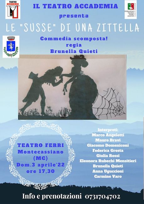 A chiudere la rassegna sarà lo spettacolo comico: “Le Susse di una zitella”, commedia ideata dalla compagnia Teatro Accademia di Pesaro, dove Lei, ingenua ereditiera, ama lui, il classico cacciatore di dote, che ovviamente la vuole solo per i suoi soldi. Per la regia di Brunella Quieti, è una commedia divertente sullo sfondo del borgo di Casteldimezzo, dove si celebrerà una vera storia d’”amore”. In questo caso, però, la vicenda dà origine a più storie interpretate con stili diversi che vanno dalla farsa alla commedia, dalla soap opera al dramma borghese… insomma una commedia“Scomposta”.
