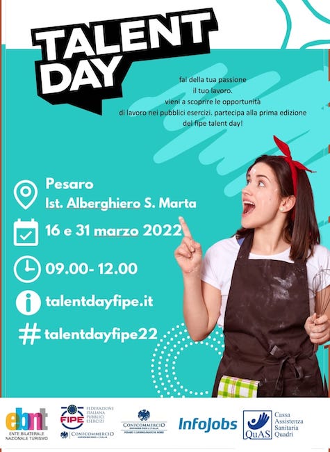 Il Talent Day Fipe è una piazza del lavoro dove un bar, un ristorante o un pubblico esercizio incontrano giovani talenti da assumere per creare quelle sinergie tra chi forma e chi impara per avviare una appassionante esperienza professionale e di vita nel settore. E’ un momento di confronto e dialogo finalizzato a costruire il mercato del lavoro del futuro per la ristorazione, la caffetteria, l’intrattenimento e il turismo. È un road show lungo tutto lo stivale che racconta il lavoro nei Pubblici Esercizi mettendo insieme imprese, lavoratori, operatori del mercato del lavoro, scuole e istituzioni e volto a far conoscere le storie di successo di chi lavora con determinazione e passione ogni giorno.