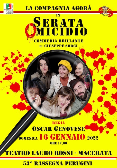 MACERATA – Un giallo alla Agata Christie dove la comicità la fa da padrona! Domenica 16 gennaio 2022, alle ore 17,30, al Teatro Lauro Rossi, appuntamento per tutti gli amanti della prosa e dei gialli, con la Compagnia “Agorà”, guidata da Oscar Genovese, che, nell’ambito della 53a Rassegna nazionale Angelo Perugini, presenta una piéce di Giuseppe Sorgi “Serata omicidio”.