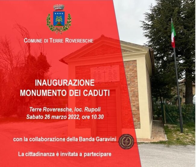 TERRE ROVERESCHE (PU) – Il Sindaco di Terre Roveresche, Antonio Sebastianelli rende noto che sabato prossimo verrà inaugurato il Monumento dei Caduti a Rupoli. Si legge nel comunicato del Sindaco: