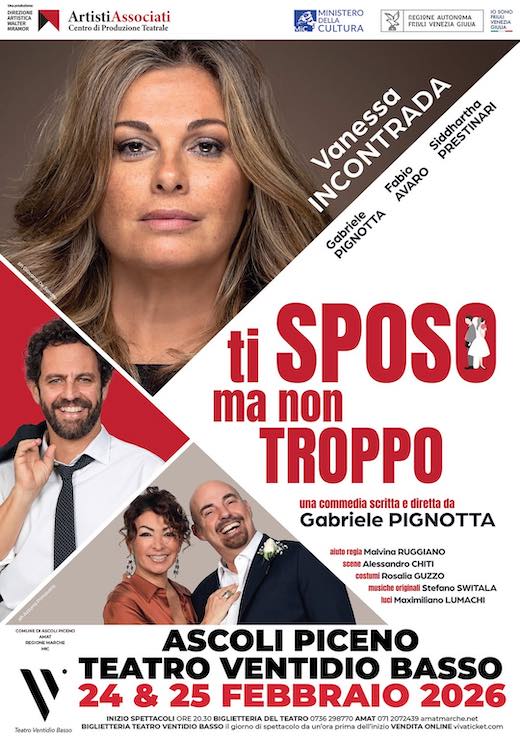 ASCOLI PICENO – Martedì 24 e mercoledì 25 febbraio, alle ore 20.30, al Teatro Ventidio Basso di Ascoli Piceno, per la Stagione 2025-26, nata dalla rinnovata collaborazione tra il Comune e l’AMAT con il contributo della Regione Marche e del MiC, andrà in scena “Ti sposo ma non troppo”, una commedia scritta e diretta da Gabriele Pignotta, con Vanessa Incontrada e Gabriele Pignotta.