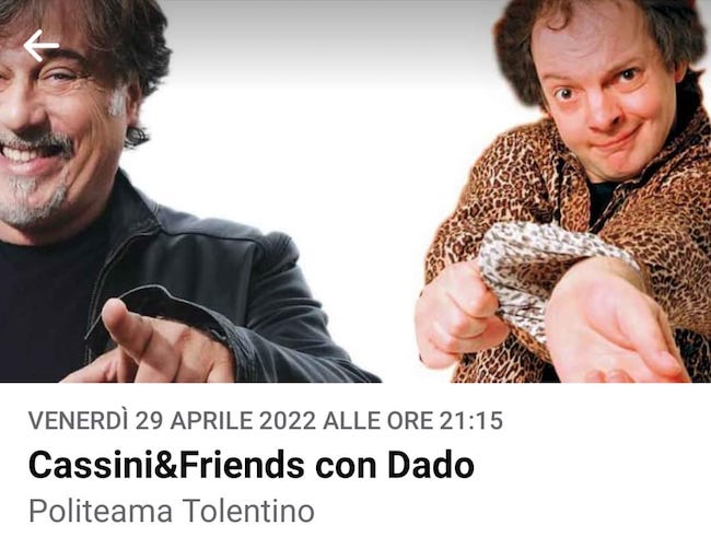 TOLENTINO – Un format comico innovativo, creato espressamente per il Politeama, che ha avuto un grande successo con due appuntamenti sold-out e che ha visto sul palco grandi comici del panorama cabarettistico nazionale. Dopo Gianluca Impastato, Gabriele Cirilli e Claudio Batta, venerdì 29 aprile alle ore 21,15 sarà la volta di Dado, ultimo ospite d’eccezione, che si esibirà al Politeama di Tolentino insieme a Dario Cassini e alcuni giovani comici.