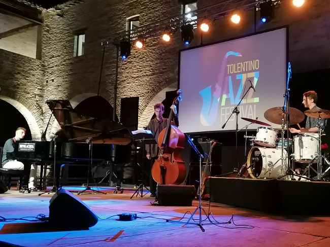 TOLENTINO (MC) – Un venerdì da leoni per la seconda giornata del Tolentino Jazz Festival con l’inaugurazione delle pregevoli mostre fotografiche “Jazz Signed” di Andrea Feliziani e “Jazz Tales” di Viviana Falcioni e due concerti di altissimo livello. Primo momento musicale Marco Marcelletti Trio, formazione abruzzese under 25 che ha pienamente catturato l’attenzione del pubblico con il suo sound raffinato e un gioco di insieme perfettamente calibrato nelle dinamiche, negli interventi solistici e negli equilibri sonori. I brani in programma, composizioni originali del pianista ventenne Marcelletti, allievo di Ramberto Ciammarughi, si sono distinti per la chiara matrice modale e un approccio armonico maturo e ben strutturato; fondamentale il ricco e variegato contributo del contrabbasso di Pietro Pancella e della batteria di Michele Santoleri. Fra le composizioni eseguite “Albatros”, “Counterpoint of Our Days” e “For Alan”; la brillante performance del talentuoso trio si è conclusa con un omaggio a Kenny Wheeler con la sua “Kind of Folk”. Il secondo concerto della serata ha segnato il sensazionale debutto dell’inedito quartetto “Happy Jazz Day 2U” composto da Massimo Manzi alla batteria, Maurizio Moscatelli ai fiati, Antonino De Luca alla fisarmonica e David Padella al contrabbasso e al basso elettrico. Spettacolare è l’aggettivo che sorge spontaneo per definire l’esibizione dei quattro musicisti che hanno letteralmente entusiasmato la platea con il loro progetto ricco di contaminazioni e innovativo nelle scelte timbriche. Dopo le pregevoli composizioni di Maurizio Moscatelli, “ Tutto Bena”, In the Beguining” e “Velut luna”, il gruppo si è lanciato in una serie di articolate e travolgenti riletture di brani provenienti dai più disparati stili e generi. Moscatelli, accattivante frontman dell’ensemble, ha sfoggiato il suo virtuosismo su numerosi strumenti a fiato passando con disinvoltura ed uguale abilità dal sax al clarinetto alla tromba fino a giungere a vari tipi di flauto dolce e alla tradizionale “vena”, aerofono di origine sarda. Autore di quasi tutti gli originalissimi arrangiamenti, Moscatelli ha proposto con una riuscita sinergia con i suoi compagni di palco “Day One” di Tali Rubinstein e “Tango pour Claude” di Richard Galliano che ha visto protagonista il talentuoso Antonino De Luca, allievo dello stesso Galliano, che sia in questa che nelle altre musiche in programma si è messo in luce per le sue spiccate capacità di interprete e solista.