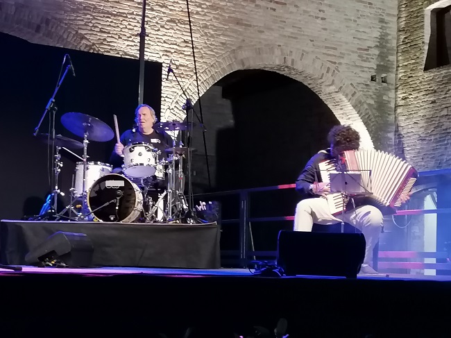 Sempre ad opera del fisarmonicista siciliano, che di recente proprio con Massimo Manzi ha realizzato il cd “Radici”, il particolare arrangiamento di “Vitti Na’ Crozza” rivisitata anche ritmicamente con un asimettrico 5/4. Non sono mancati gli omaggi alla musica italiana con “Anna e Marco” di Lucio Dalla e “Parlami d’amore Mariù”; esaltanti le incursioni nel pop con le travolgente versione di “Shock The Monkey” di Peter Gabriel, che ha visto all’opera in uno spericolato solo al basso David Padella, ugualmente eccellente anche negli interventi al contrabbasso. Fondamentale il contributo di Massimo Manzi che ha arricchito con la sua sapiente creatività ritmica tutto il progetto sostenendo sempre in modo dinamico e pulsante il motore musicale della performance. Al brillante finale a suon di “Happy” ha fatto seguito un bis strepitoso: “Donna Lee” di Charlie Parker con uno strabiliante Moscatelli al flauto dolce a velocità supersonica. Quartetto stellare e concerto travolgente.