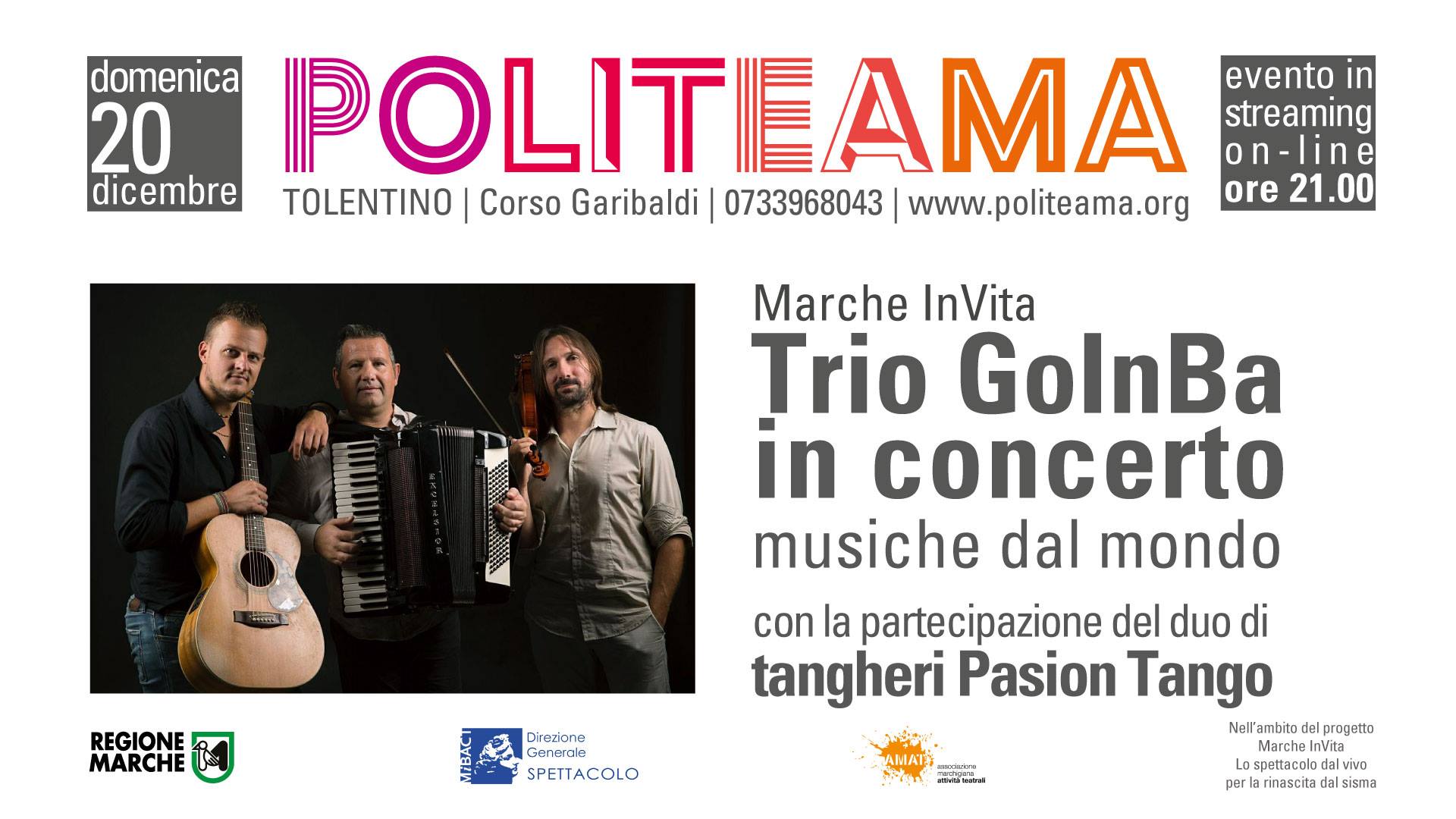 TOLENTINO – Dato il perdurare delle restrizioni per il contrasto della pandemia da Covid-19 e la sospensione degli eventi aperti al pubblico, il Politeama presenta un nuovo evento online. Il Trio GoInBa, con la partecipazione del duo di tangheri Pasiòn Tango, si esibirà in diretta streaming dal palco del Politeama di Tolentino, domenica 20 dicembre, nella stessa data in cui era programmato l’evento live ma con orario ore 21,00. Il concerto-spettacolo sarà visibile gratuitamente in diretta sia sulla pagina Facebook, al link https://fb.me/e/1uHKoKfjK che sul Canale YouTube, al link https://youtu.be/_QJ4IkJwkWY del Politeama. Decisione questa, presa insieme alla Direttrice artistica Cinzia Salerno in collaborazione con Eliconia Eventi di Patrizia Brignoccolo, per dare a tutti la possibilità di assistere da casa e gratuitamente.