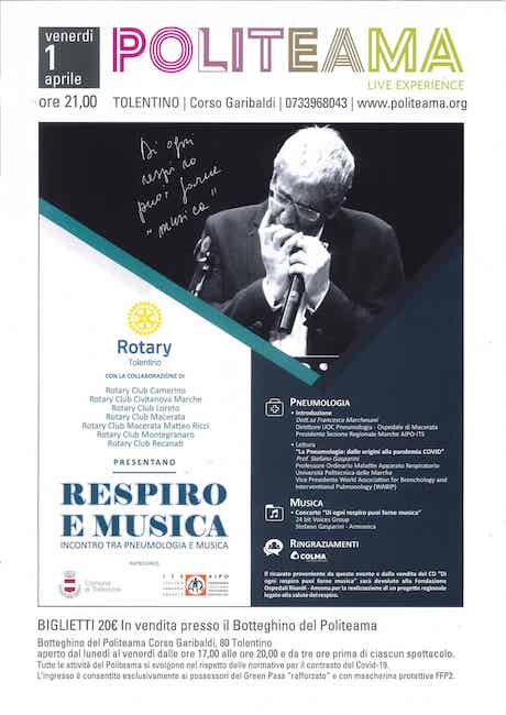 TOLENTINO – Il Rotary Club Tolentino, con il patrocinio del Comune di Tolentino e dell’Associazione Italiana Pneumologi Ospedalieri (AIPO-ITS), ha organizzato per l’1 aprile, alle 21, al Politeama di Tolentino, lo spettacolo “Respiro e musica”. Collaborano all’evento in interclub anche il Rotary di Camerino, Civitanova Marche, Loreto, Macerata, Macerata “Matteo Ricci”, Montegranaro, Recanati.
