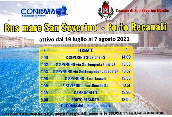 SAN SEVERINO MARCHE – Da lunedì,19 luglio 2021, torna il servizio “Bus mare San Severino Marche – Porto Recanati” che il Comune, in collaborazione con la società di servizi per la mobilità Contram SpA, proporrà tutti i giorni feriali, dal lunedì al sabato, escluse le domeniche e i festivi. Le corse termineranno poi il 7 agosto.