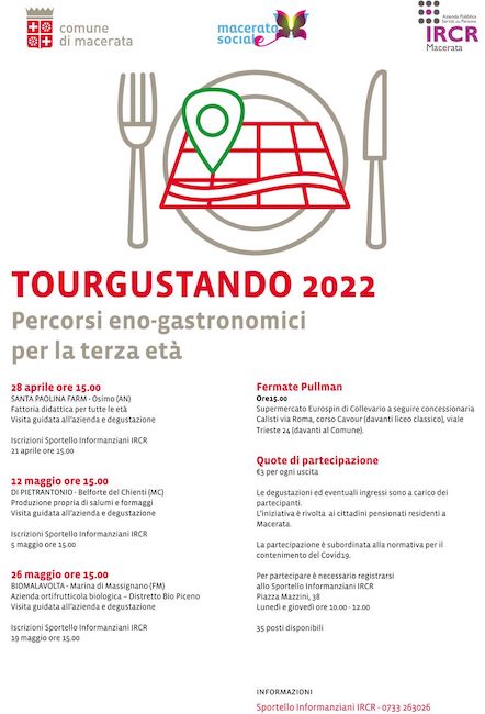 MACERATA – Ritorna “Tourgustando. Percorsi enogastronomici per la terza età”, l’iniziativa dedicata ai cittadini pensionati residenti a Macerata, organizzata e promossa dall’assessorato ai Servizi sociali, guidato dal vice sindaco Francesca D’Alessandro, in collaborazione con IRCR Macerata.