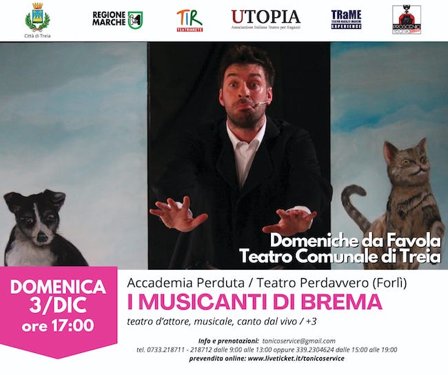 Quattro sono gli appuntamenti, tutti nella splendida cornice del Teatro Comunale, con altrettante compagnie professionali tra le più accreditate nel panorama del teatro ragazzi italiano, si comincia il 3 Dicembre con la compagnia romagnola “Accademia Perduta-Teatro Perdavvero” di Forlì, formazione sul campo da più di quarant’anni, riconosciuta dal MIC-Ministero per la Cultura e dalla Regione Emilia Romagna, tra le realtà italiane più interessanti nel mondo del Teatro per le nuove generazioni, presenteranno una delle loro più fortunate produzioni: “I MUSICANTI DI BREMA”, un lavoro dove l’arte dell’attore si mescola con la musica dal vivo e con le immagini, per un risultato di grande suggestione, capace di catturare l’attenzione dei più piccoli e dei loro accompagnatori.